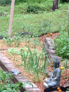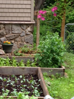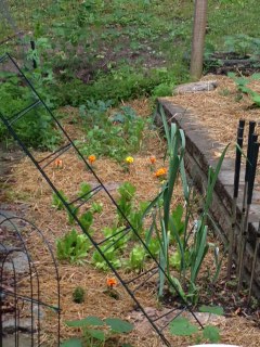 This is my spring garden because once the end of June comes and the sun starts dipping down, the trees start to shade this garden and it gets very little sun. I hope that I will have some things to eat out of here soon!