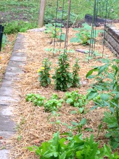 In this middle row I have zucchini and yellow squash towards the fence and the some pole beans next to them. I have lots of basil so that I can make pesto for the freezer. There are tomatoes, peppers and more lettuce towards the front.